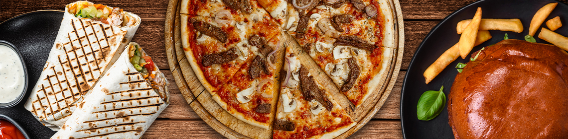 Pizza Sauce, Red Donner, Red Onion, Mixed Peppers, Gherkins & Cheese